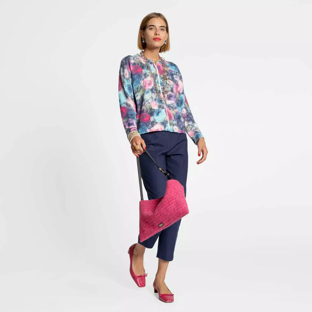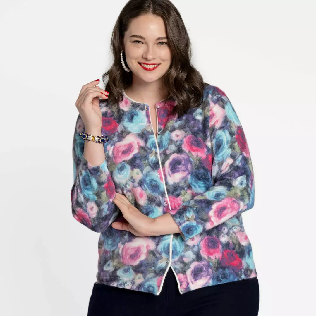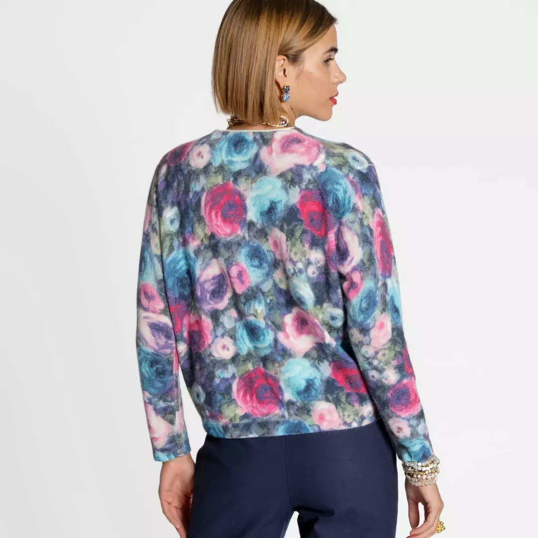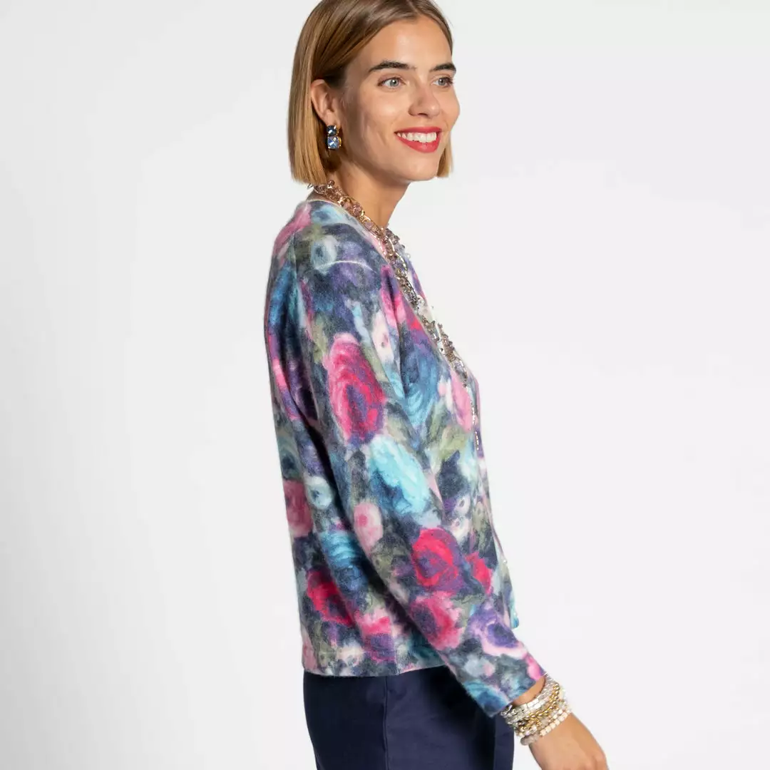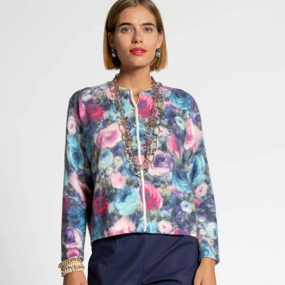 Our favorite Darling Cardigan in our new jewel toned floral print featuring blues and pinks – the perfect layering cardigan for every day.
