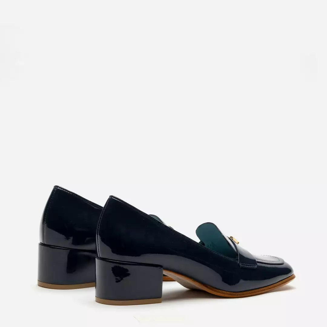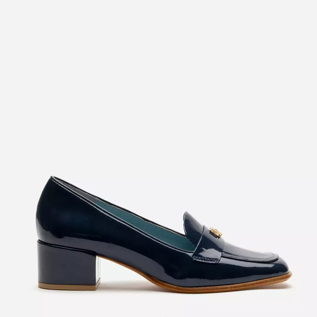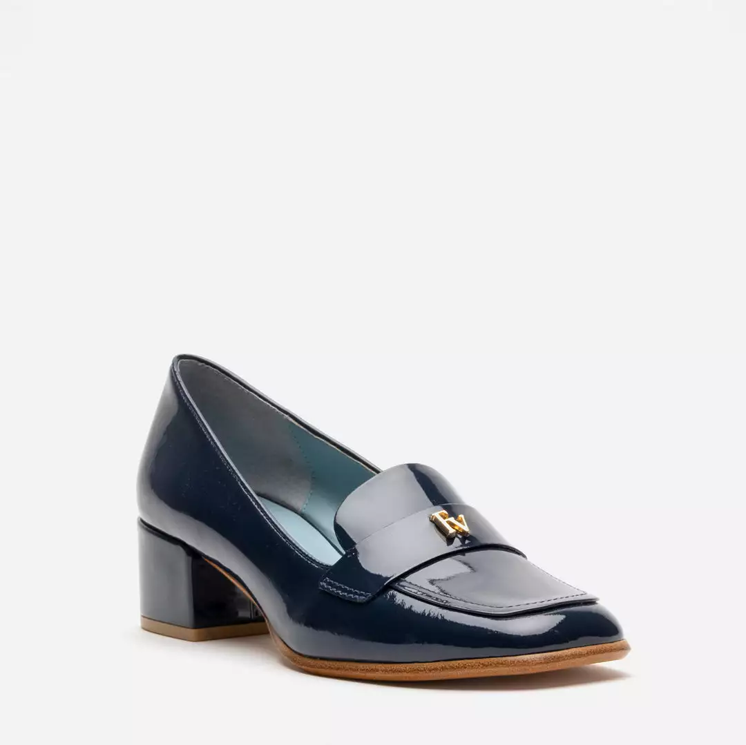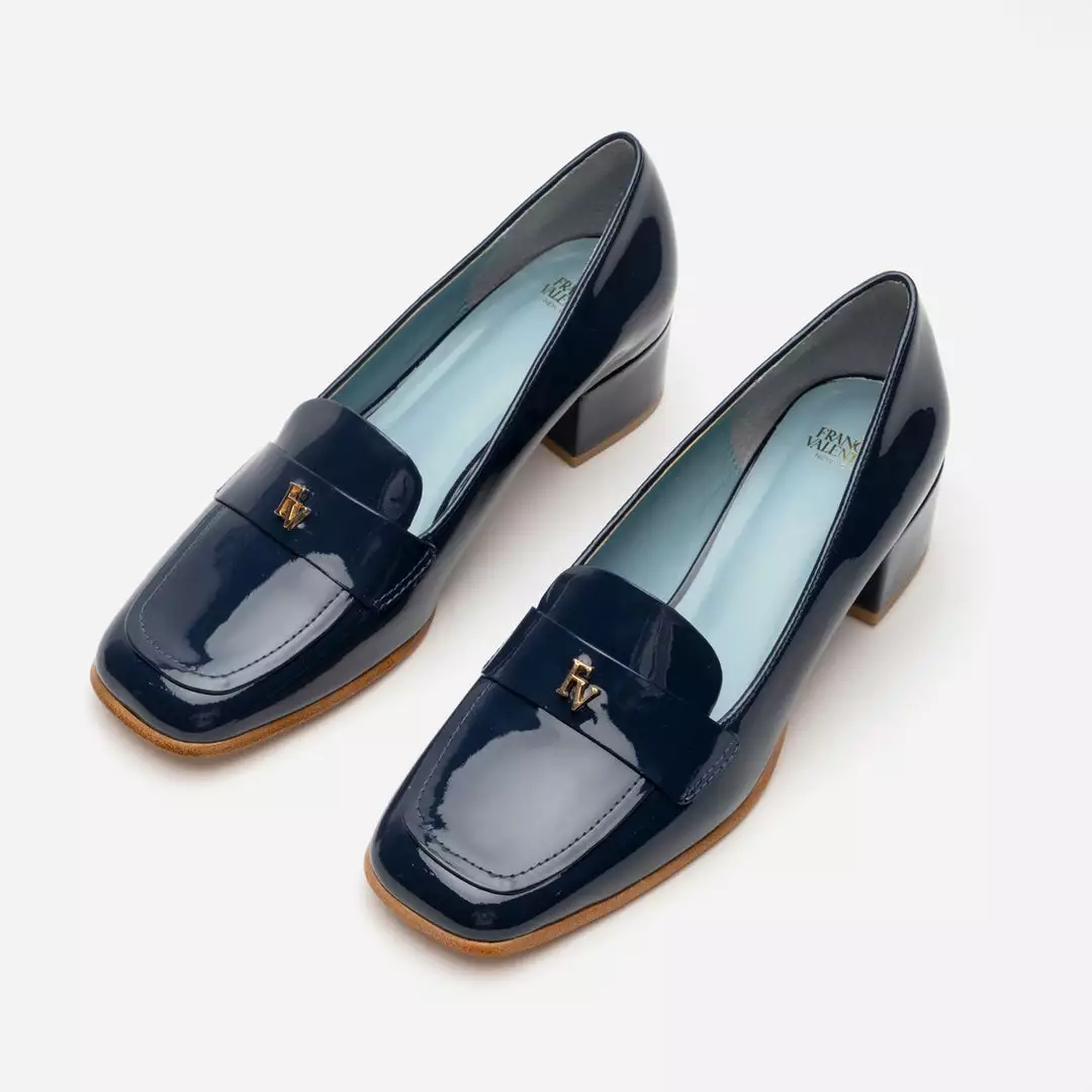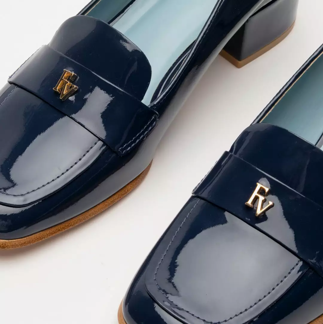 Meet Twiggy, our new soft patent square-toed loafer which features subtle gold FV logo-buckle hardware and a stacked block heel.