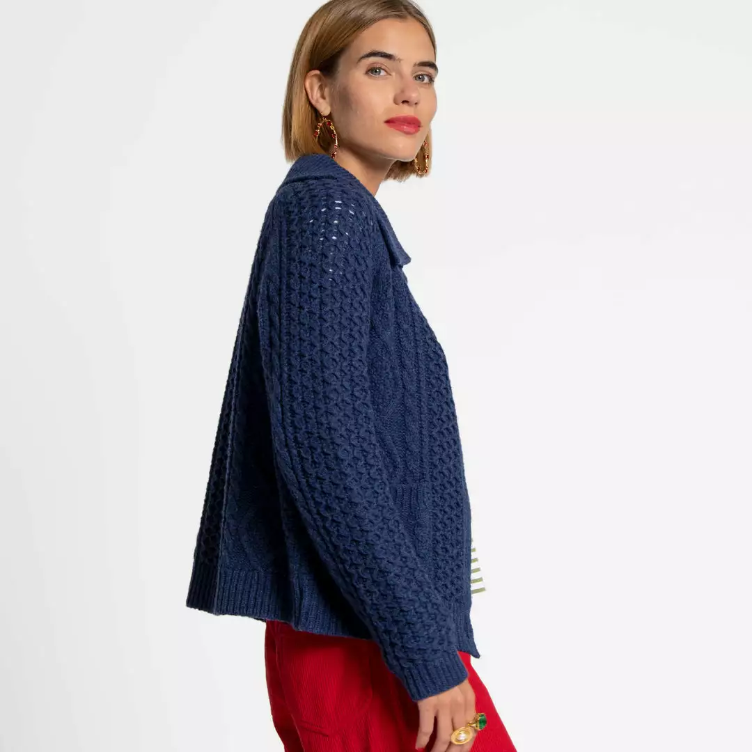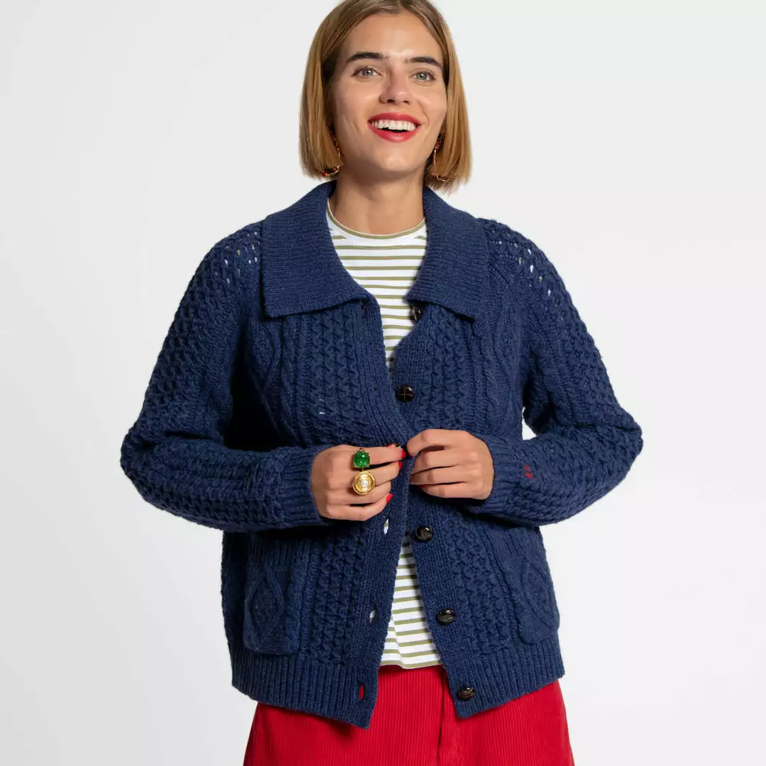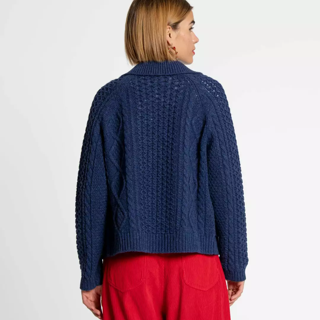 Our best selling vintage inspired Aran style lambswool Fisherman Sweater, now in navy. Often styled in our campaign photoshoots, this sweater is equal parts stylish and cozy. Intricate weaving and leather finished buttons add a special finishing touch to this sweater of the season.