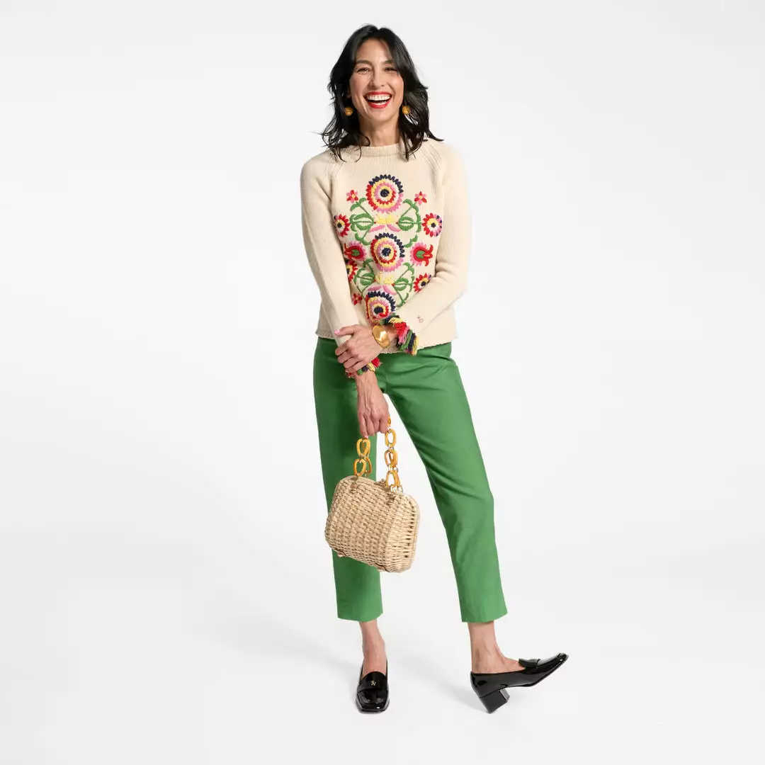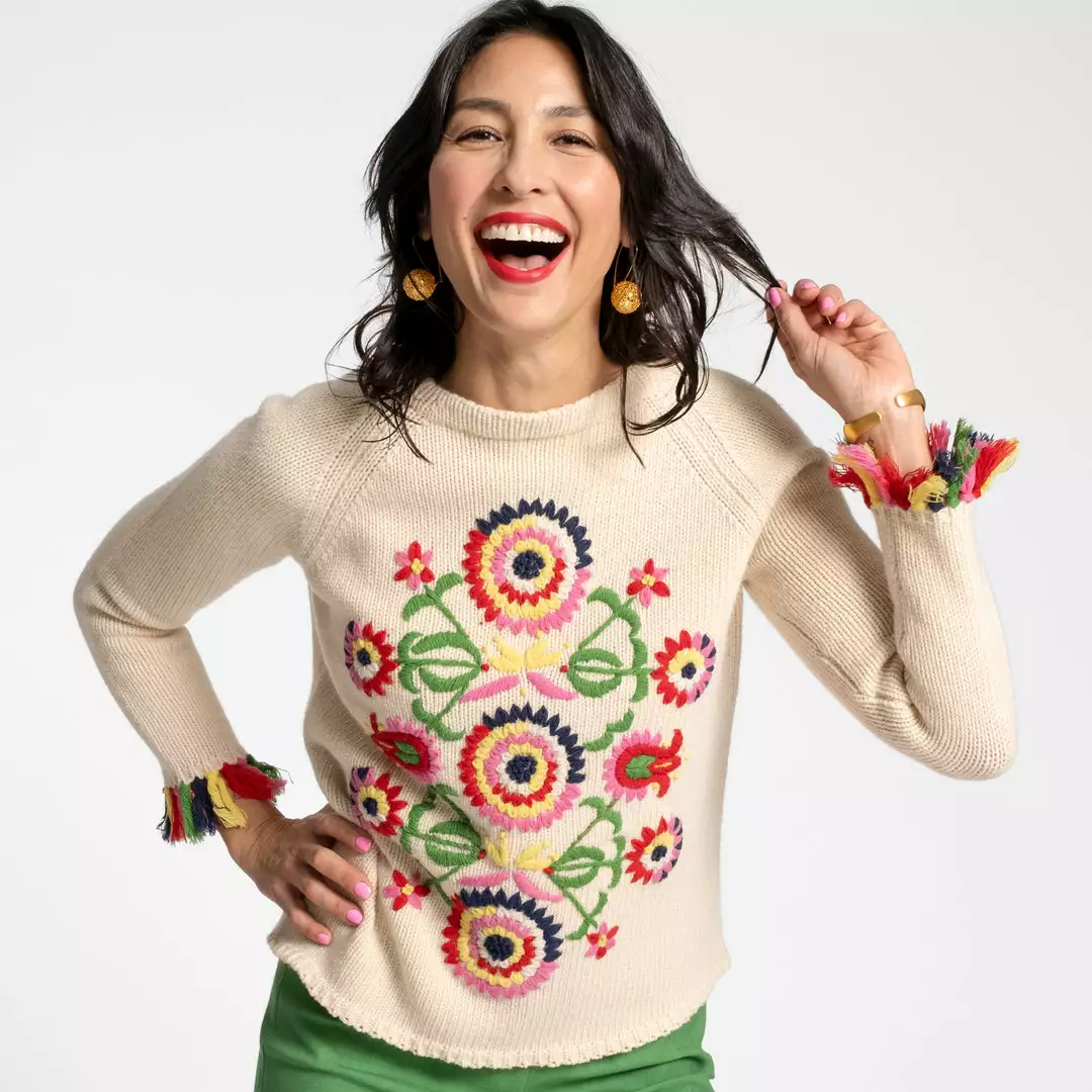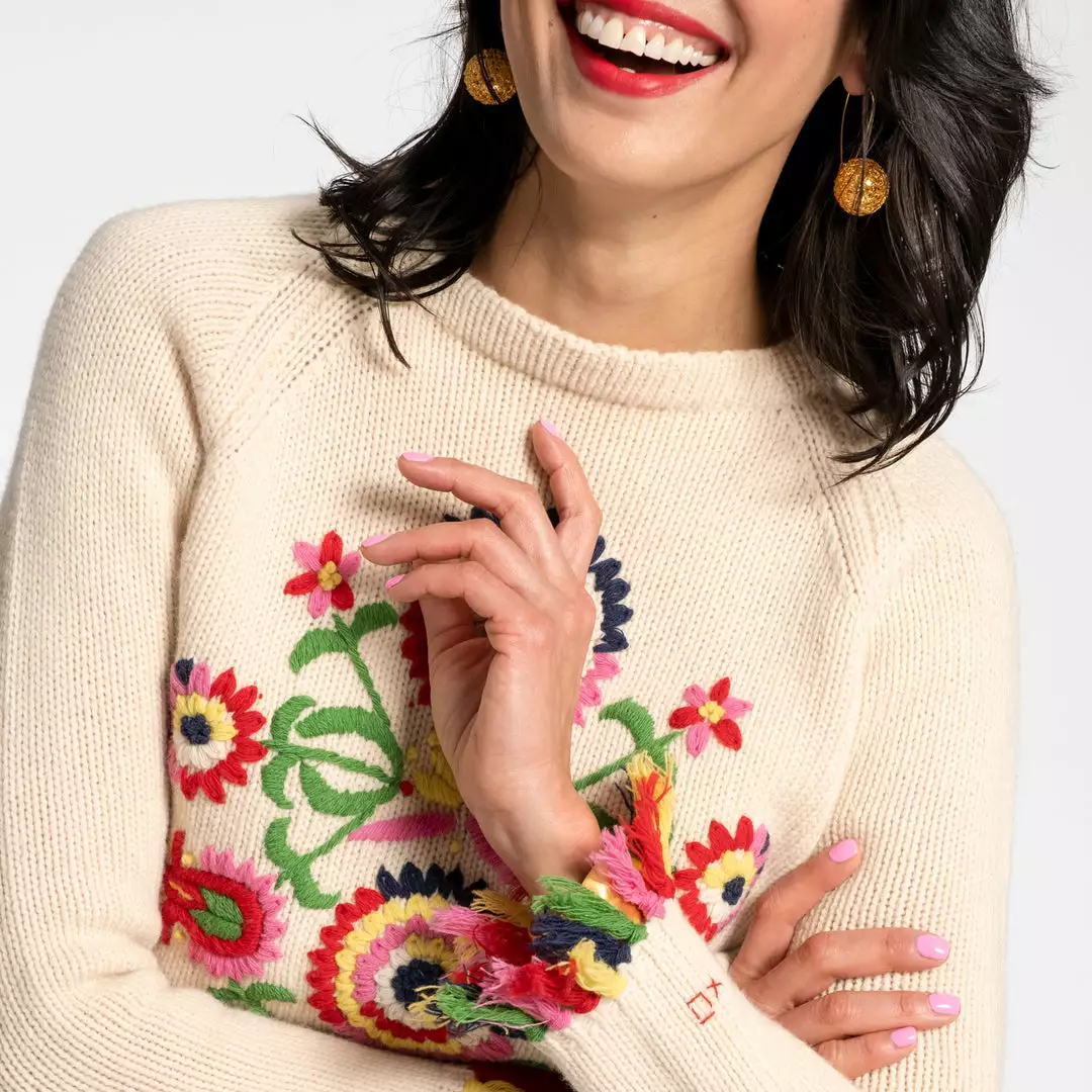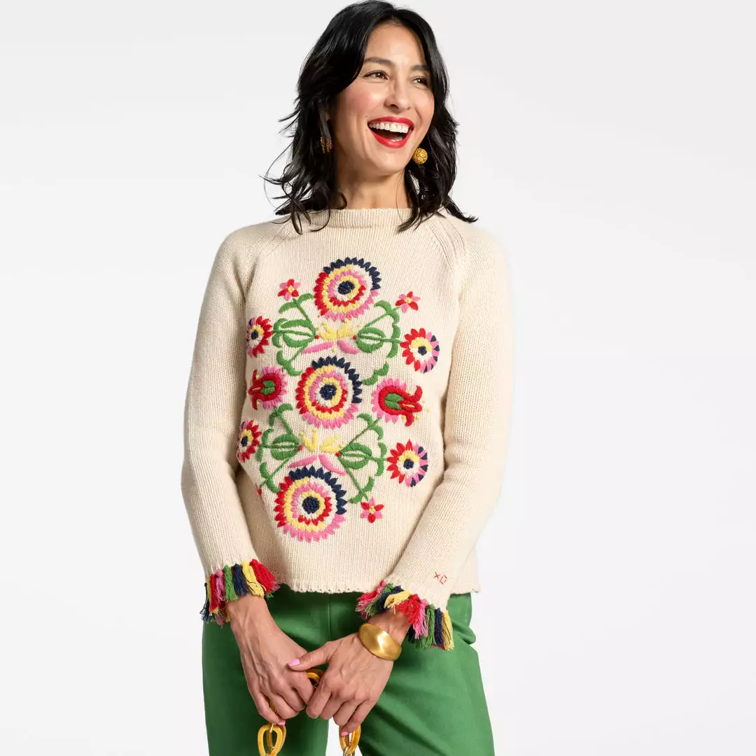 Our Barberton Daisy Fringe Crewneck Sweater is a vintage inspired piece featuring a hand embroidered design. Its hand knotted multi colored fringe sleeve cuff adds the perfect pop of color! Hand knit gauge, classic Raglan sleeve armhole and crew neck.