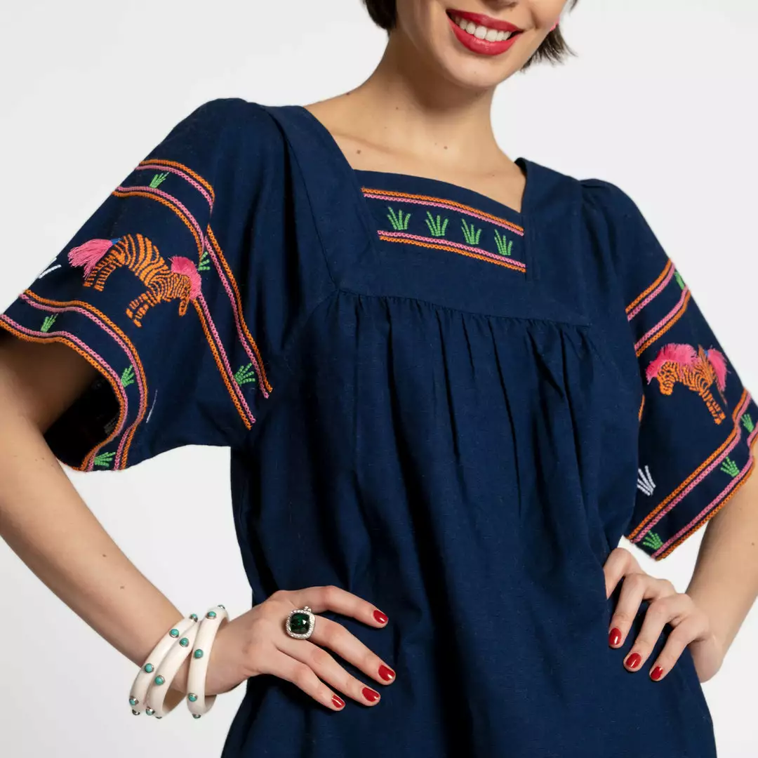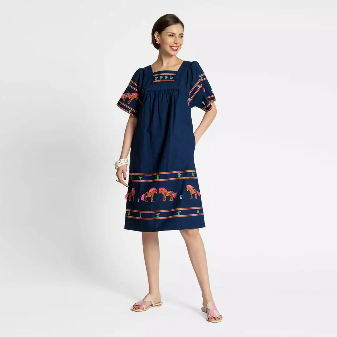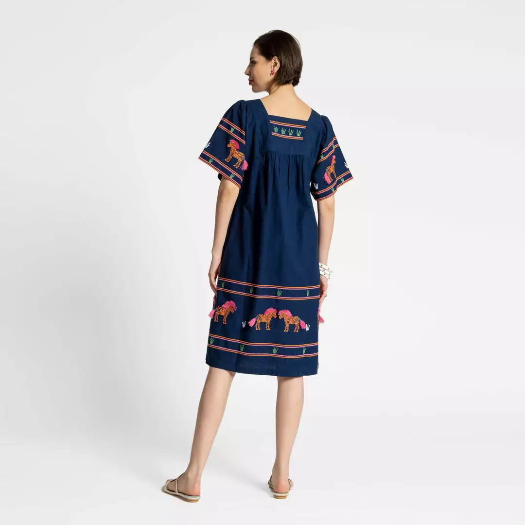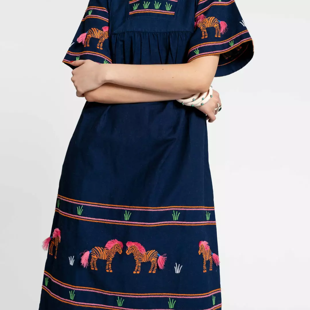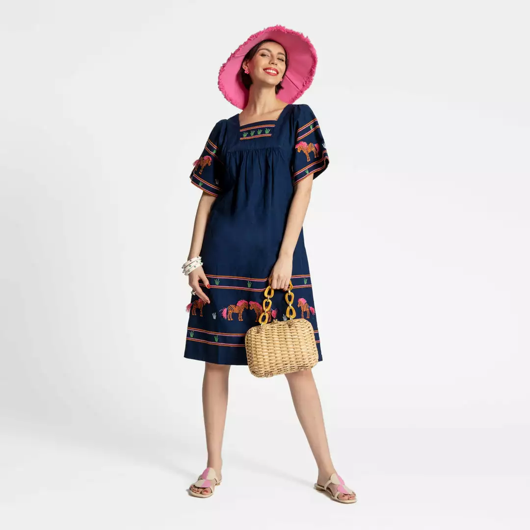 The Zebra Picnic Dress is a breezy must have for all of your sunny days. Colorful zebra embroidery and fringe details add pops of color to this new warm weather staple. Pair with any of our baskets and sandals for a perfect outfit.