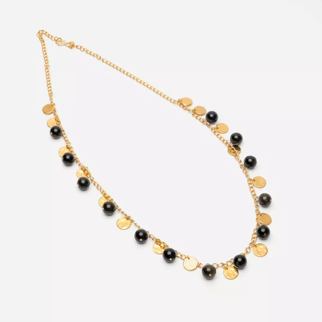 Textural discs in plated precious metals are arranged with black beads add shine and color to this statement making necklace.Â