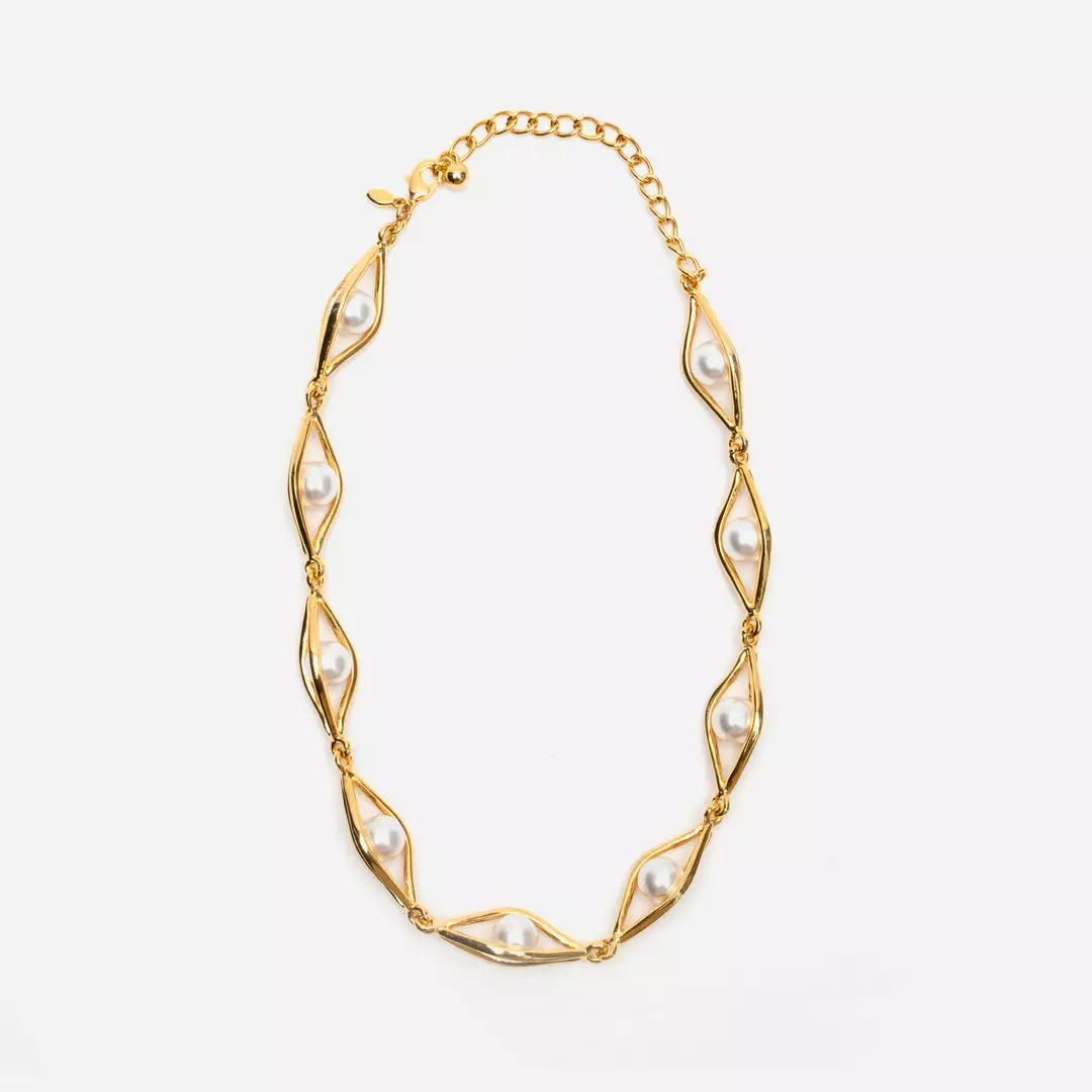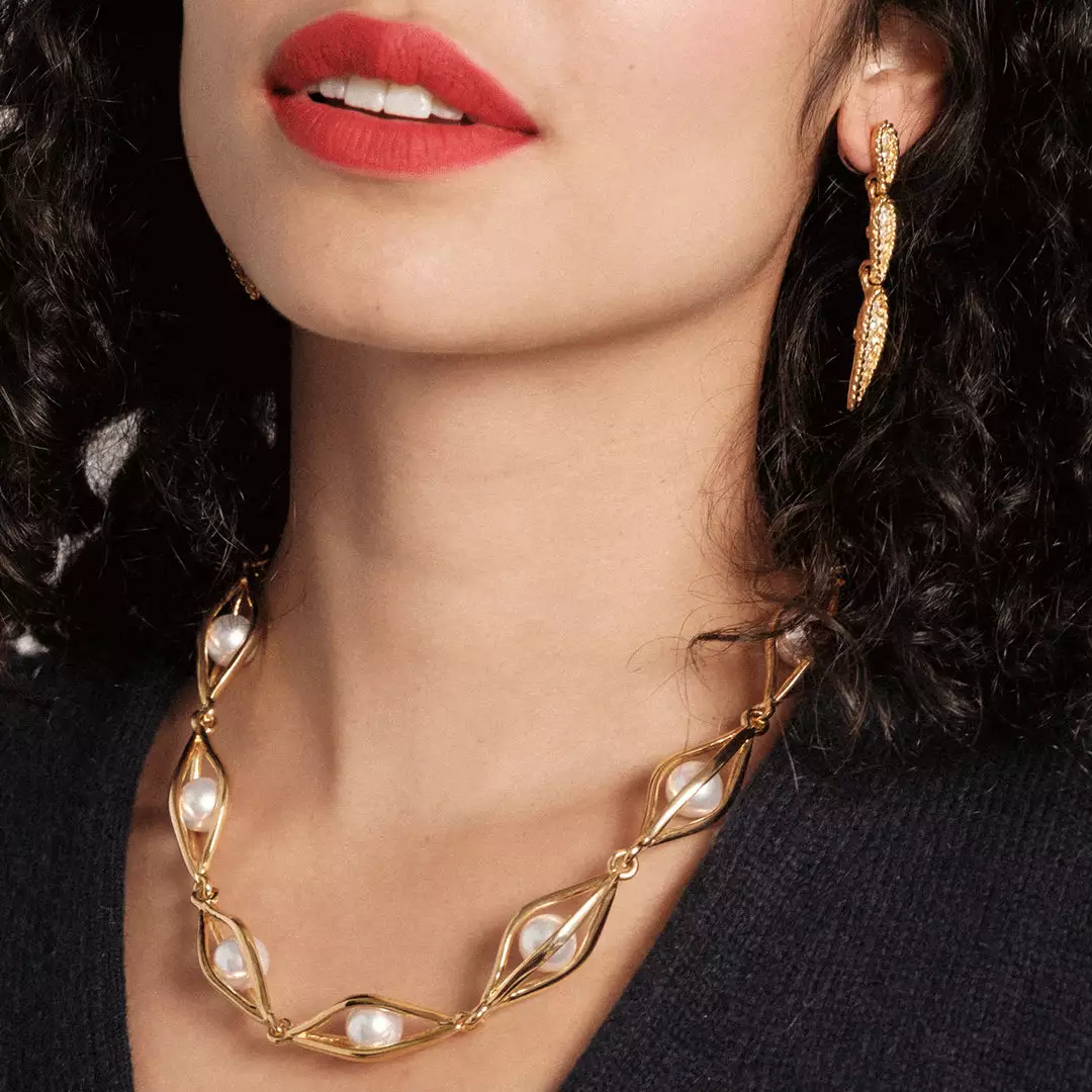 The Pearl Basket Necklace, elegant with the perfect touch of shimmer and shine.