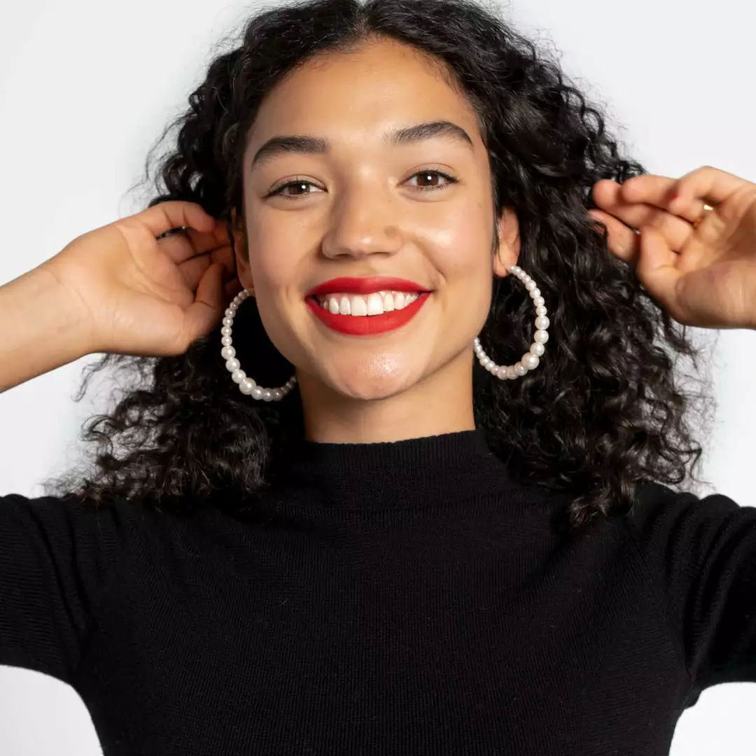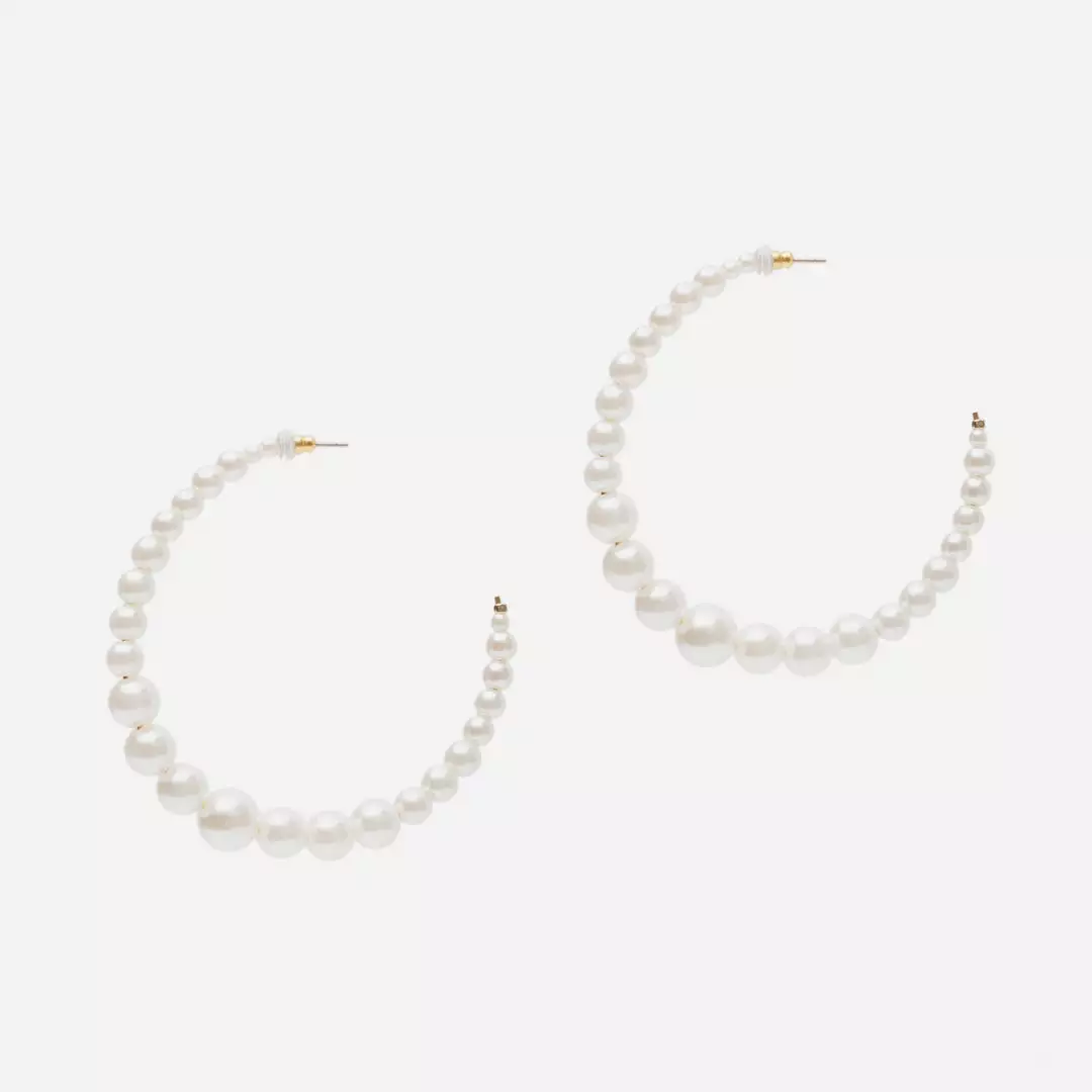 Our Pearl Hoop Earrings, gold with white pearl beads, effortlessly elegant.Â