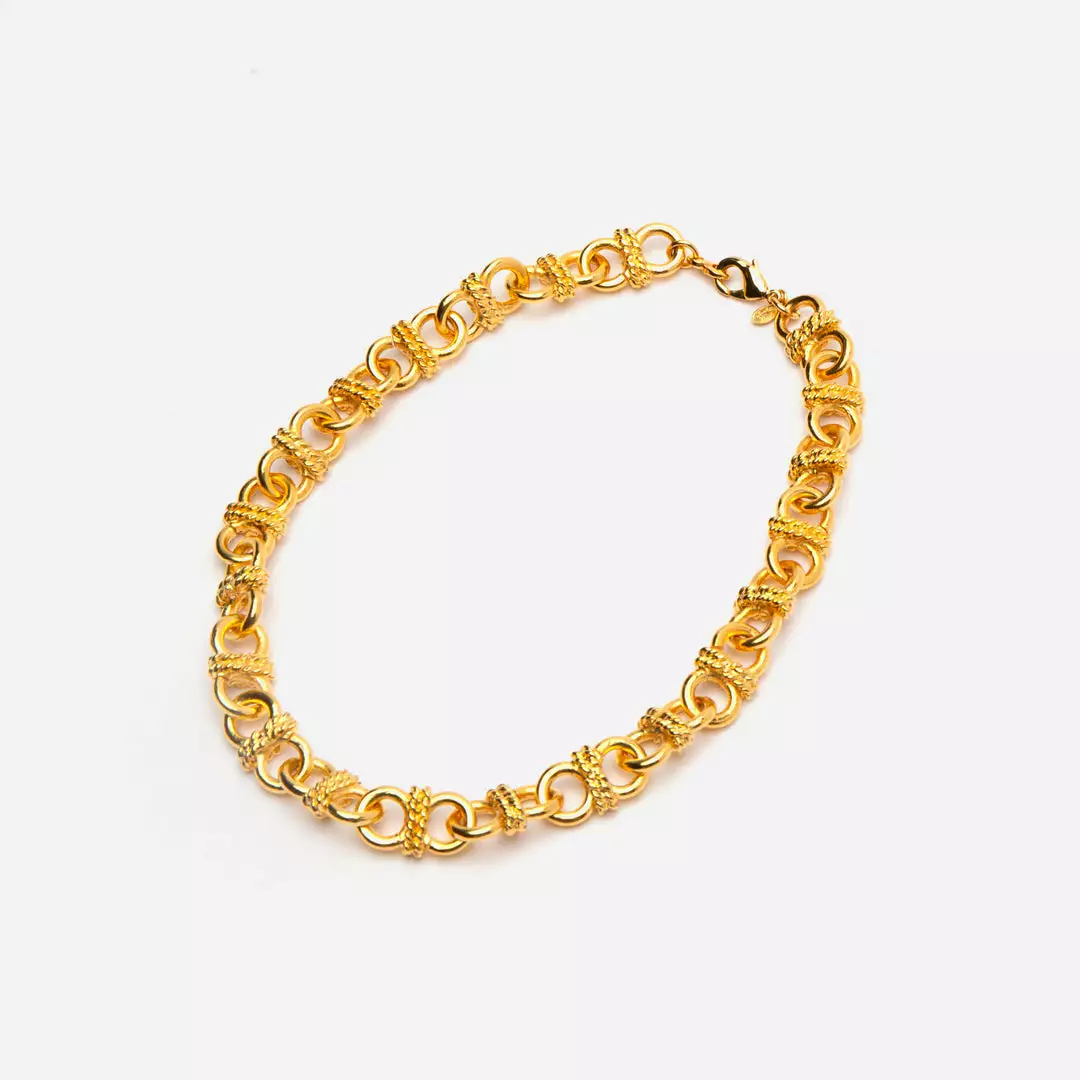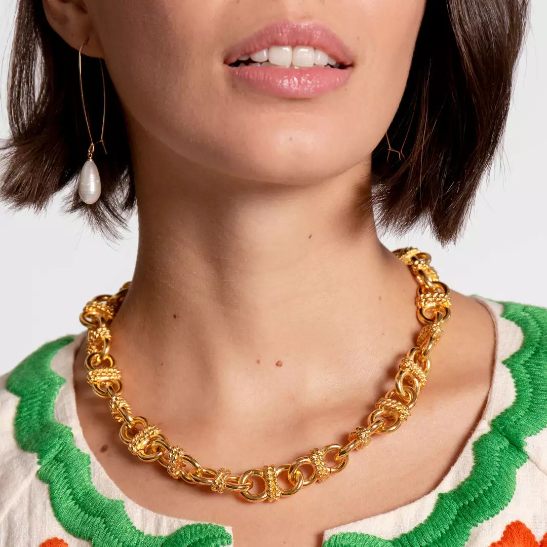Our Braided Chain Link Necklace features brightly shining gold links, a dramatic addition to any neckline.