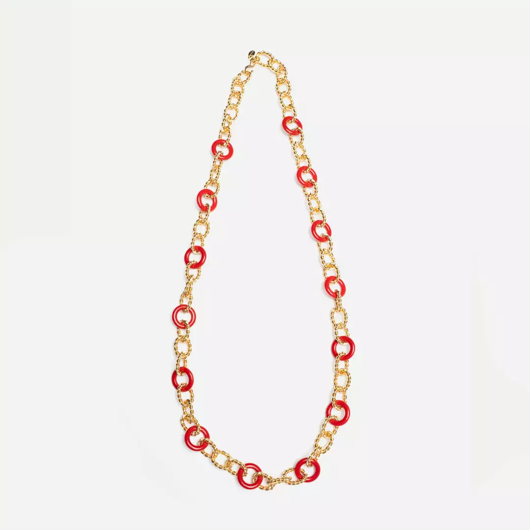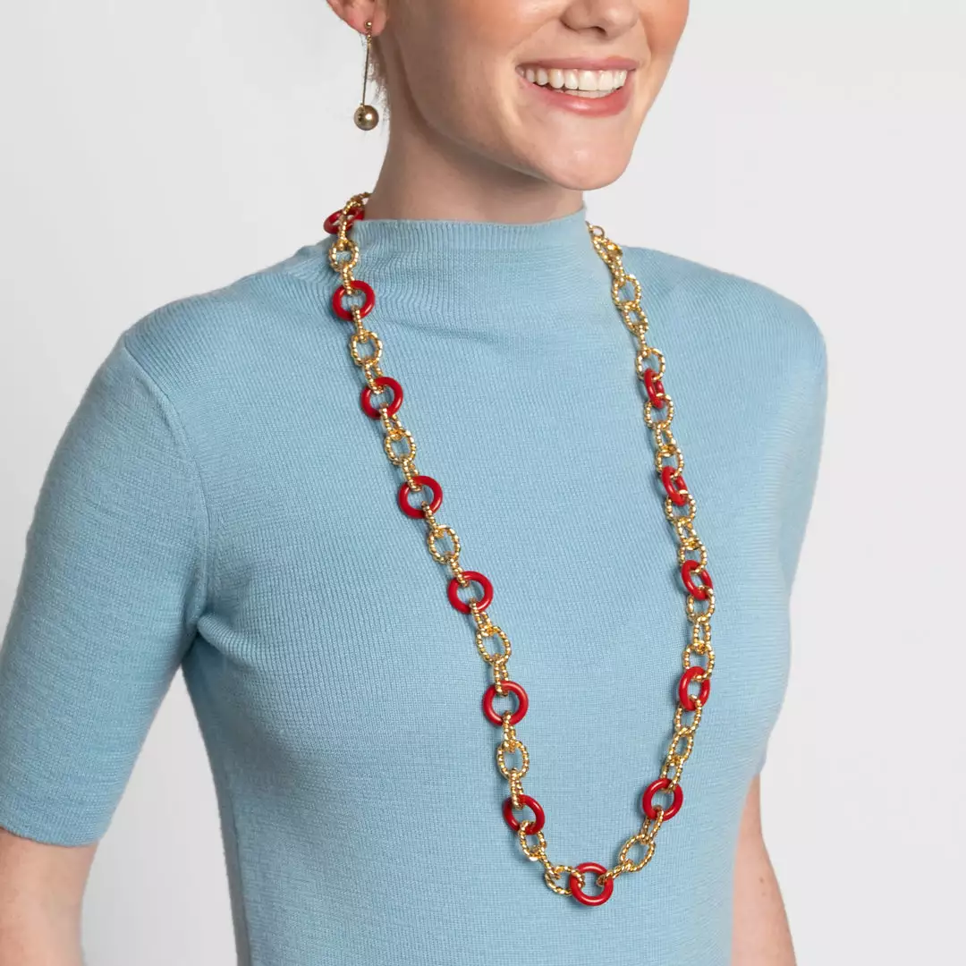 We love layering necklaces at Frances Valentine and we love the mix of the bold red discs with brushed gold links. Worn on its own or layered with one of our gold link necklaces the Red Gold Disc Necklace is easy to style with nearly everything.