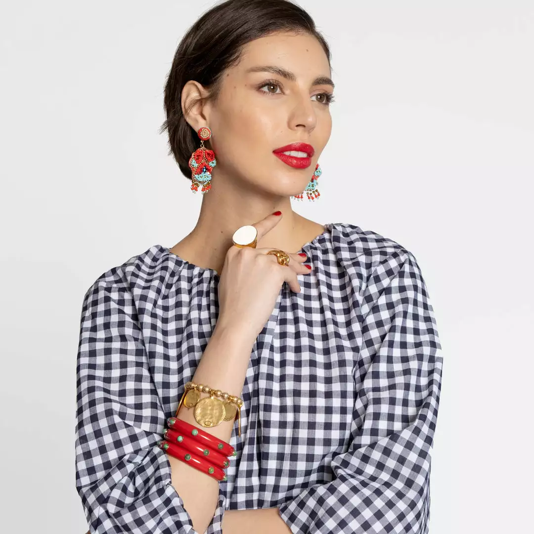 Our new Gold Shilling Bracelet is the perfect piece to add some shine to your outfit. Gold beads and coin discs dangle and move with your wrist and pairs perfectly with our Gold Shilling Coin Ring.