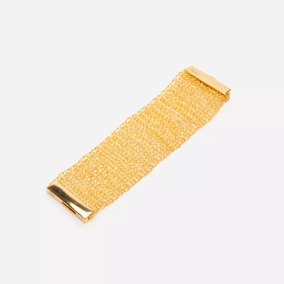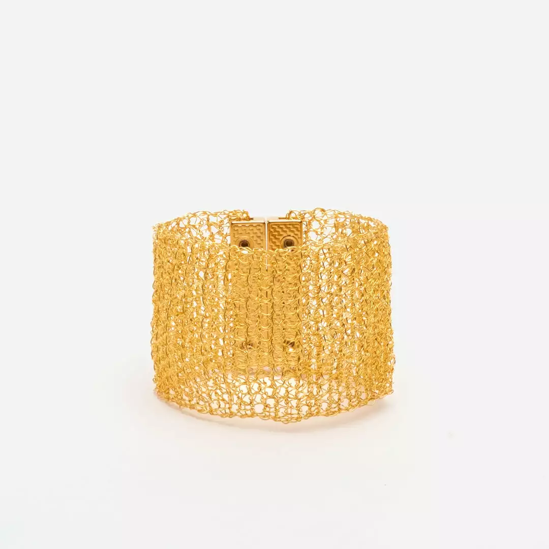This Crochet Mesh Cuff Bracelet features a sleek crocheted design in lightweight gold wire, allowing for all day wear.Â