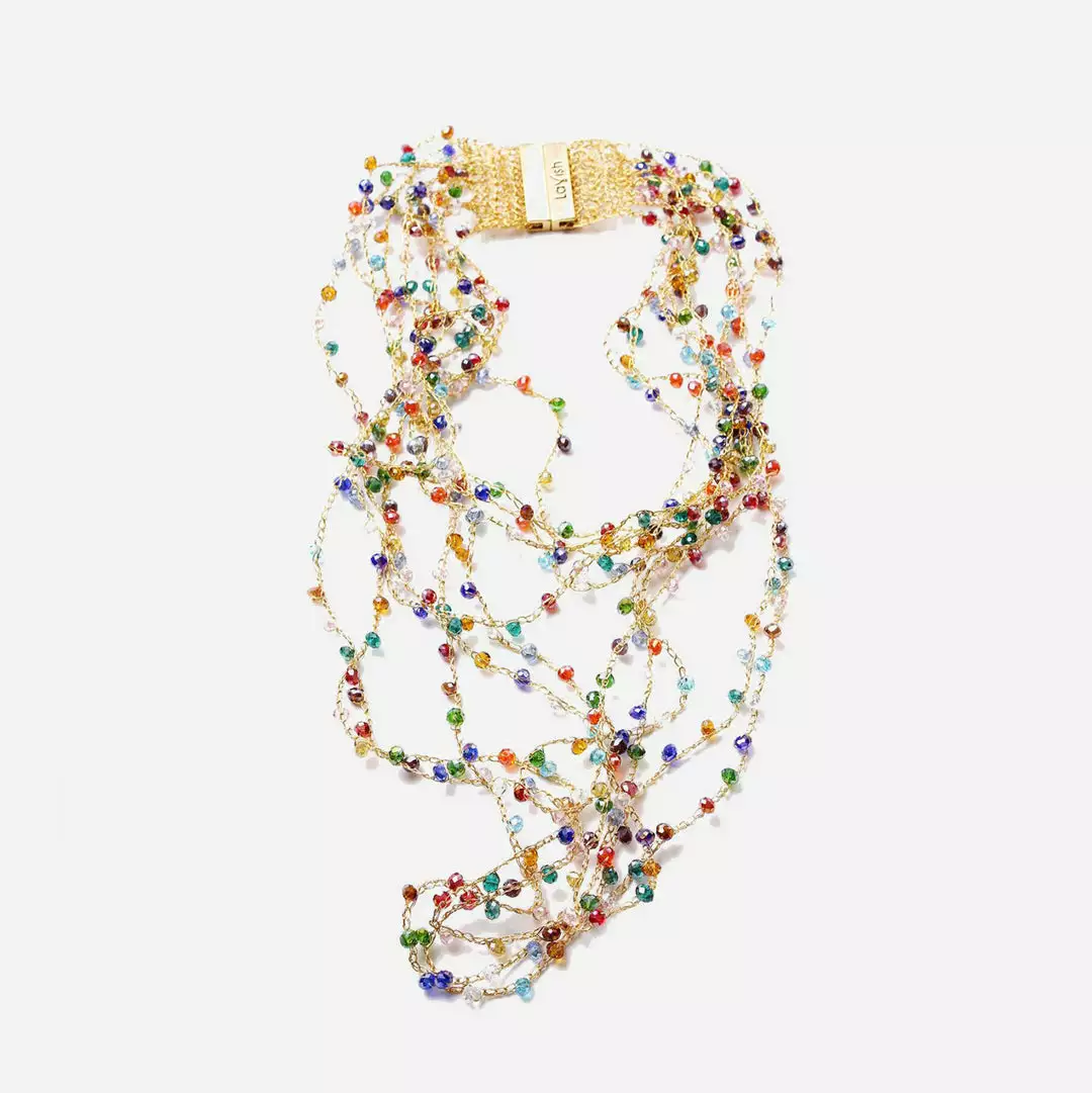 This Multi String Beaded Crochet Necklace is our new favorite statement making piece of jewelry. Layers of colorful stones and crystals add a textural detail to this bold necklace.
