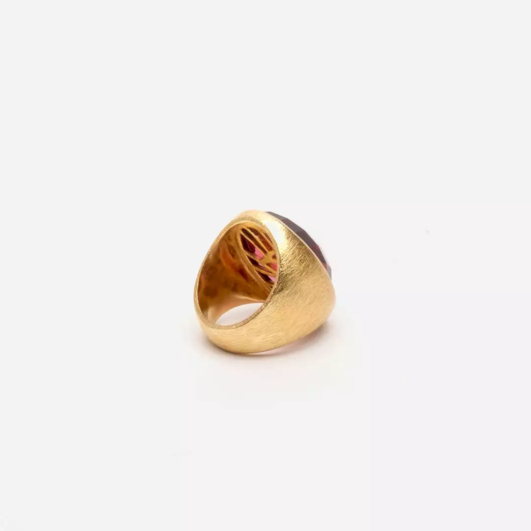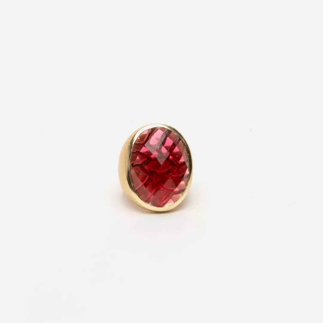 The Marzia Statement Ring features a mother of pearl base stone with crystal red tourmaline on top, creating the perfect shade.