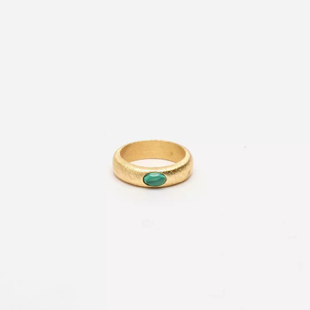 The Oklahoma Ring features a small navet shaped malachite stone on a thick gold band, a sleek and stylish ring.
