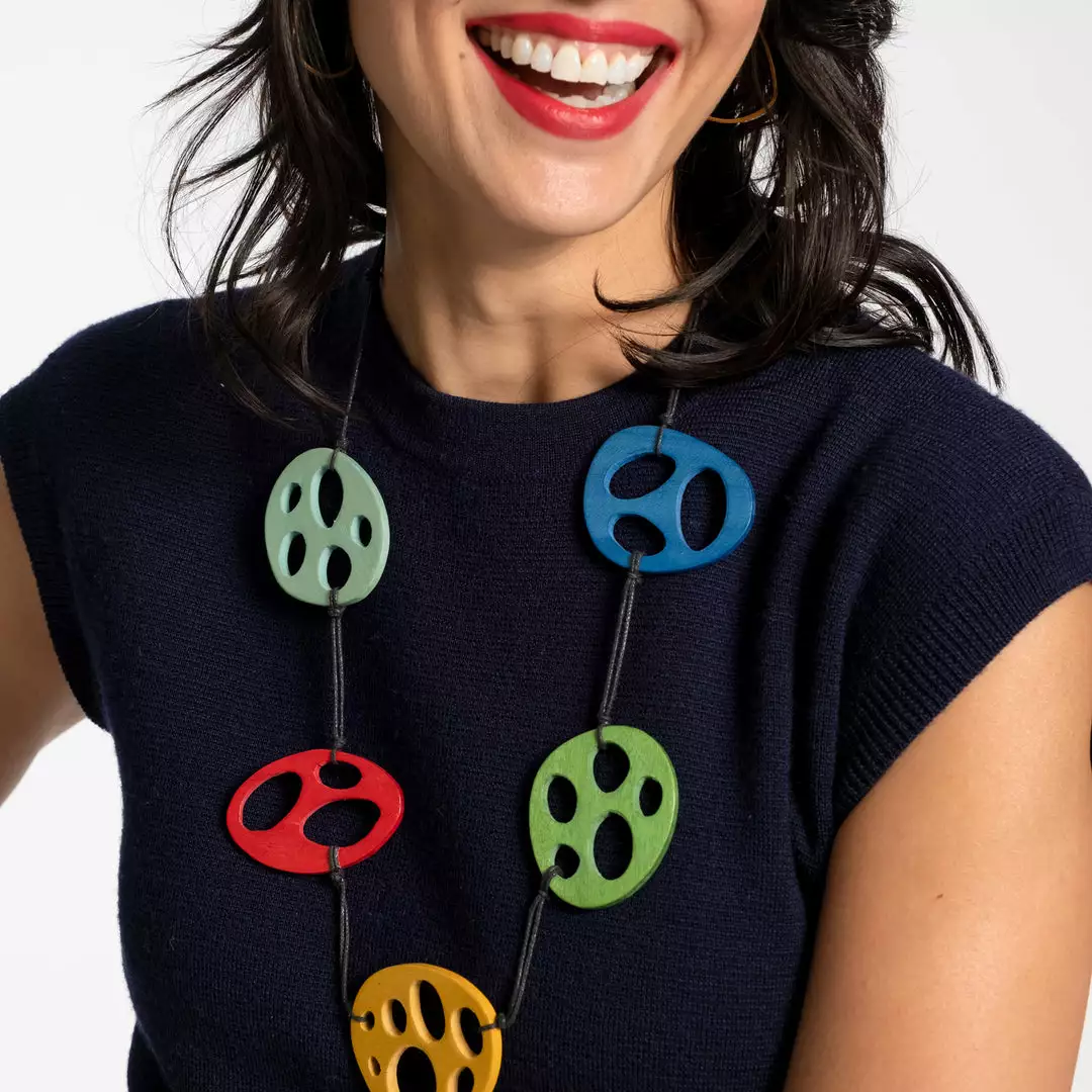 This fun and funky wooden necklace is sure to make any outfit pop! Each bead is carved out in its own design and hand painted in its own vibrant color. Sporadically hung on an adjustable black wax cord. Pair this necklace with coordinating earrings for the complete look.