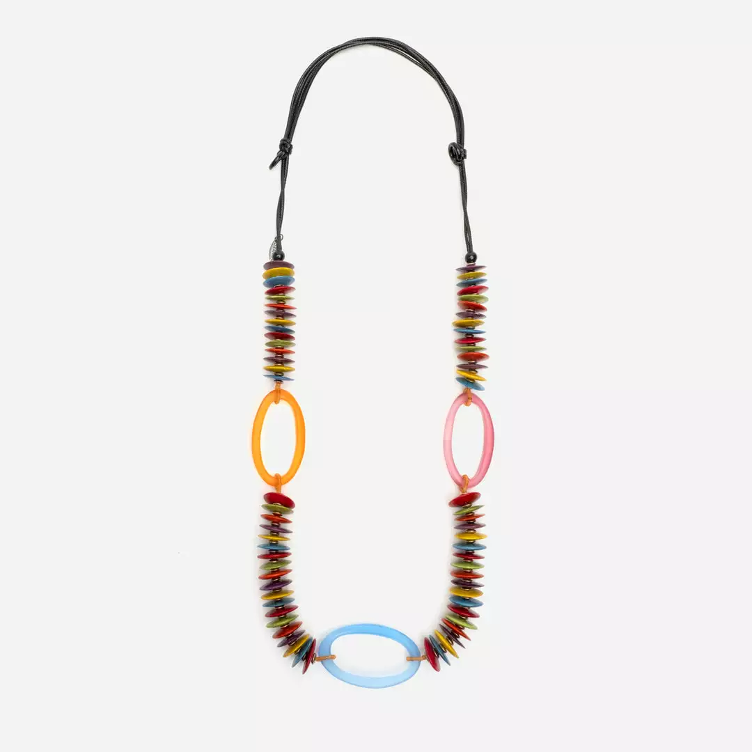 The Eleanor Necklace is a handcrafted statement necklace using a mix of wood and resin to create a unique design. The pattern comes together with vibrant lime color wood beads stacked together with tiny beads in between and accented with resin ovals. All strung on an adjustable lime wax cord, you can choose the length you prefer.Â
