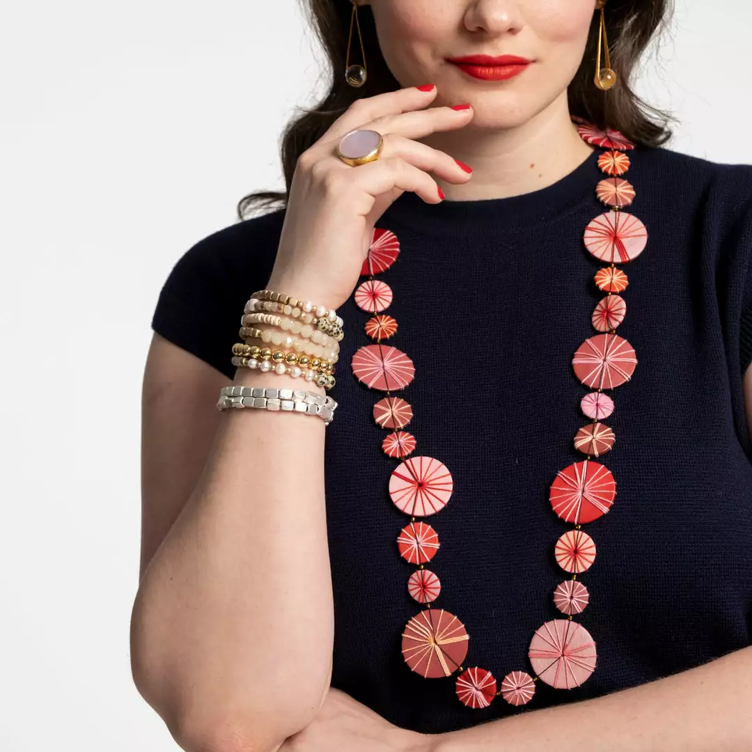 We absolutely love the Leilani Necklace! Round blue, green and aqua wooden beads are layered together and complemented by a thin cotton thread that wraps around the bead. This piece has no closure and easily slips on and off, making this statement necklace bold, beautiful, and versatile!