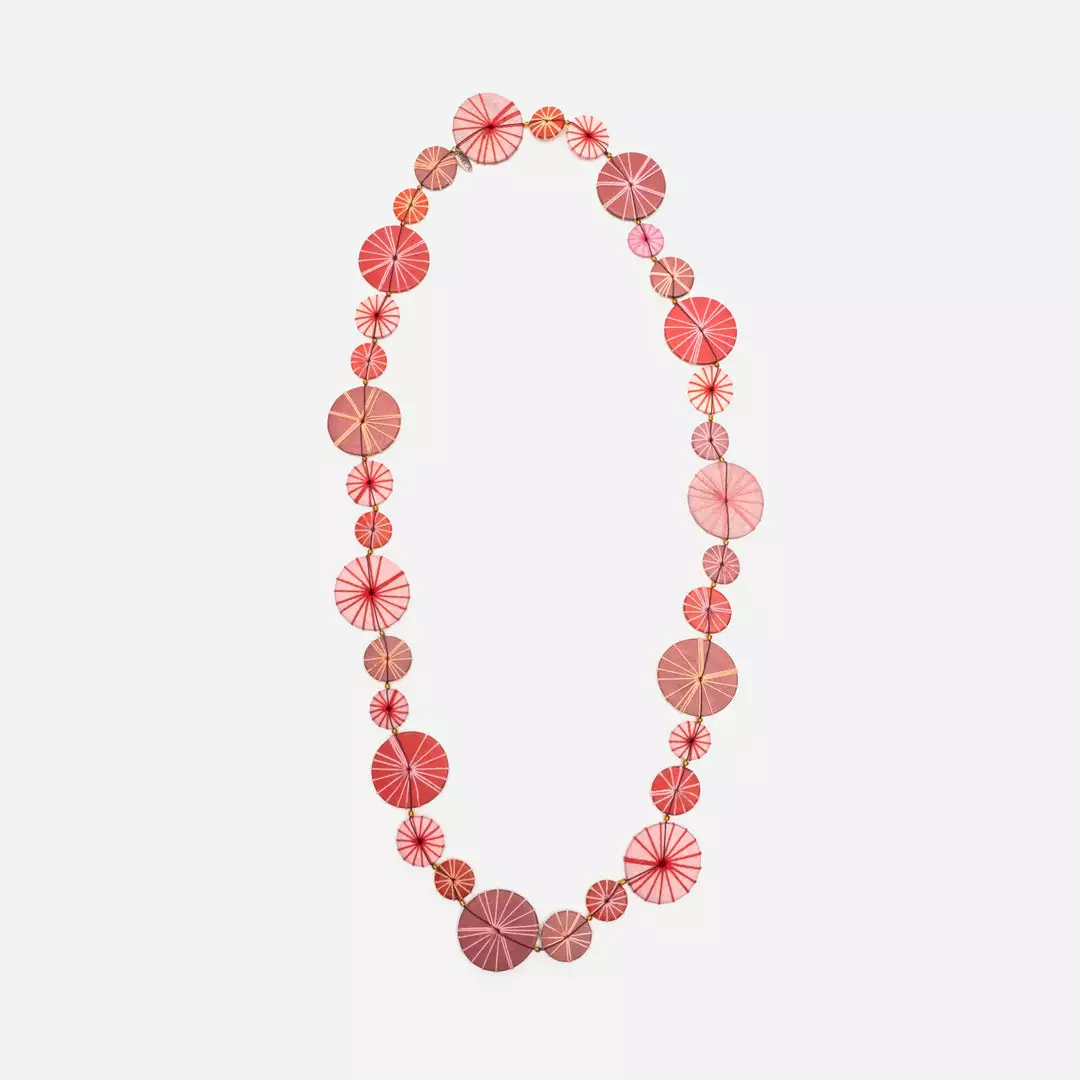 We absolutely love the Leilani Necklace! Round pink, red and coral wooden beads are layered together and complemented by a thin cotton thread that wraps around the bead. This piece has no closure and easily slips on and off, making this statement necklace bold, beautiful, and versatile!